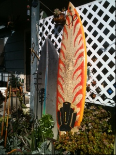 The Encinitas Surfboards shape on the left can be easily set up as a quad or single fin. The flame thrower is a Greg Nelson hand shape.